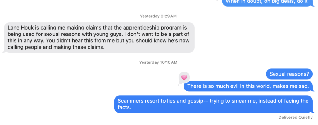 He let me know that Lane Houk is now calling people and making disturbing personal accusations.